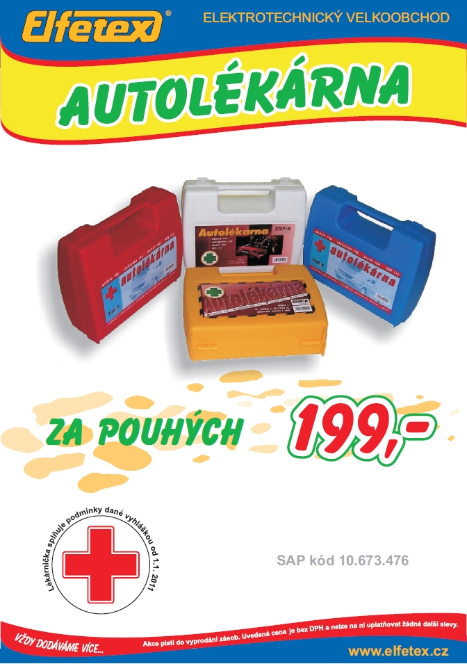 Od 1. ledna 2011 musejí mít všichni řidiči ve vozidlech nové autolékárničky. Pořiďte si jí včas, levně a pohodlně v Elfetexu.